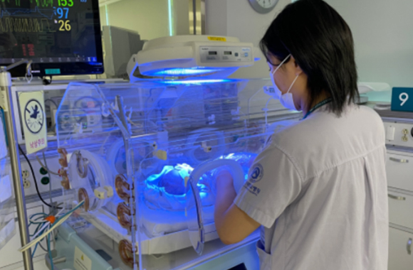 환아는 기저귀만 채운 후, 옷을 모두 벗기고 눈을 보호하기 위해 안대를 착용합니다. 이 후 보육기 위에 광선치료 기구의 조명을 켜서 피부에 빛을 쪼여줍니다.