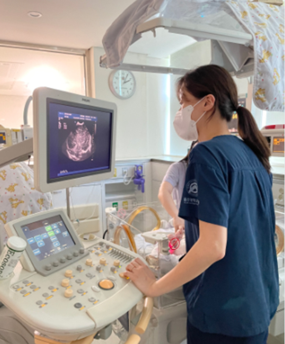 신생아집중치료실에 입원 중인 환아는 따로 이동하지 않고 초음파전문의가 침상 옆에서 직접 검사를 시행합니다.