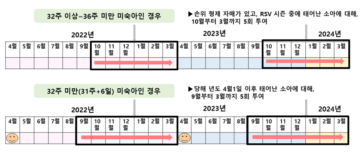 - 투여시점 및 투여 기간 : RSV 바이러스 계절 시작 전 9월부터~3월까지 총 5회 투여
