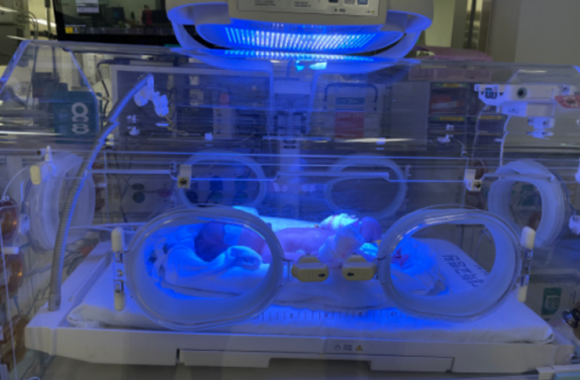 환아는 기저귀만 채운 후, 옷을 모두 벗기고 눈을 보호하기 위해 안대를 착용합니다. 이 후 보육기 위에 광선치료 기구의 조명을 켜서 피부에 빛을 쪼여줍니다.